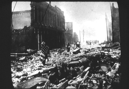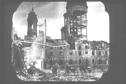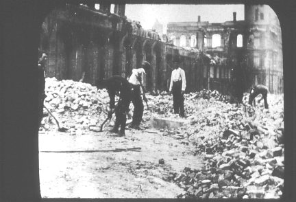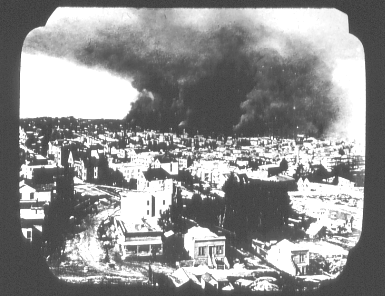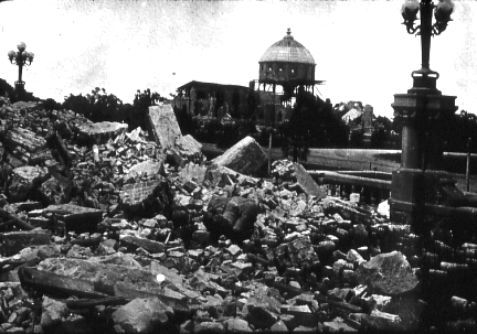 Also, to supplement my little-girl memory, I have additional reference material in a collection of photographs a newspaper reporter gave us, [included at end of story.] Papa had them made into stereopticon slides to illustrate the lectures he sometimes gave before civic clubs or school groups. He never lost an opportunity to explain the value of being ready. I heard his account of the earthquake enough time to remember most details.